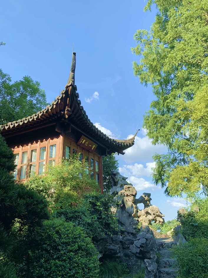 园濒湖构台榭,有船坞,以水池为中心,曲水小桥,与西湖相通,有“静必居”、“一镜天开”两景区,布局典雅,构思精巧,别具情趣。这里曲廊环绕、假山叠石、花木簇拥、精致典雅,是举办大、中、小各种游园雅集、香会、茶会、文人雅集的不二之选。