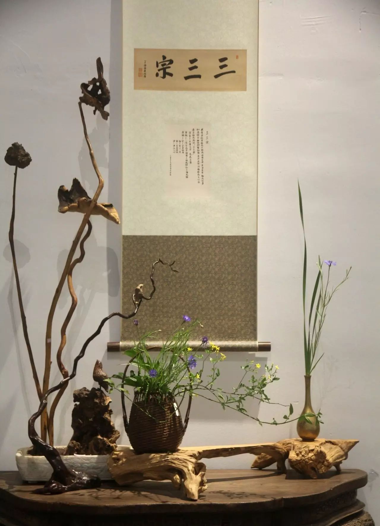 承香堂研习插花十余载,感怀自深。某日晏坐,观花如梦,知色悟空,顿明删繁就 简、道法自然,乃为插花之心法,遂自创插花流派《三三宗》。