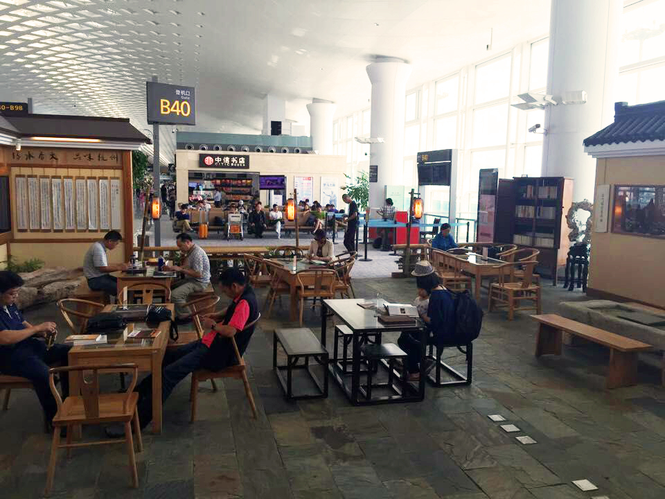 承香堂人文候机区打破了机场原有的候机形式,在承香堂门口开辟了免费阅读人文候机区庭院。在这富有中国传统文化气息的庭院中,你可以免费坐下来,在书架上取一本书,充实地度过候机时间。