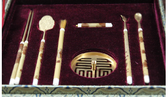 描述:嵌象牙锦盒,印香(篆香)道具