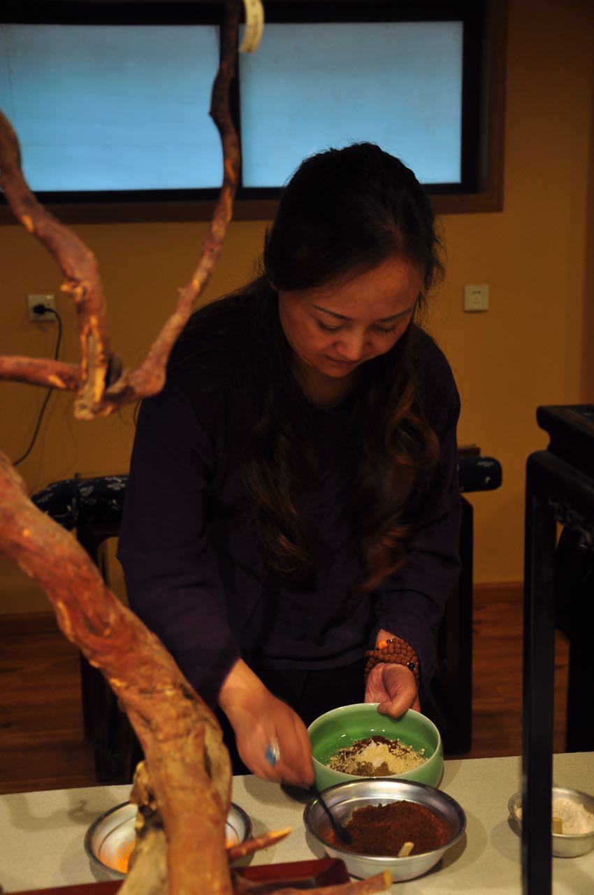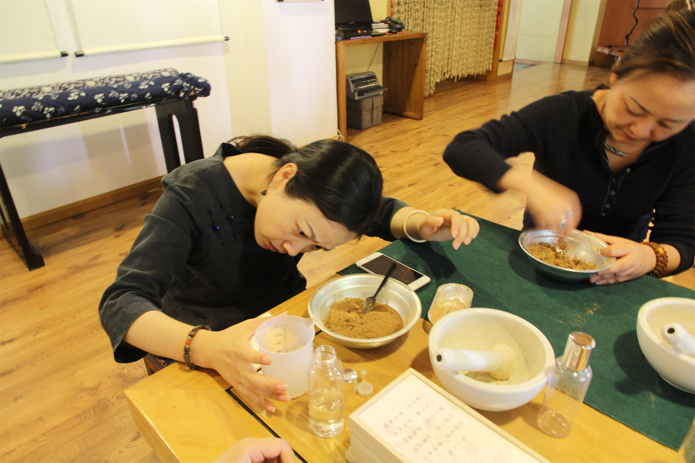 学员们通过与各种香料的接触,了解香料粉末的触感和香气的独特香型,并在合和香粉的过程中,感受香气的变化。