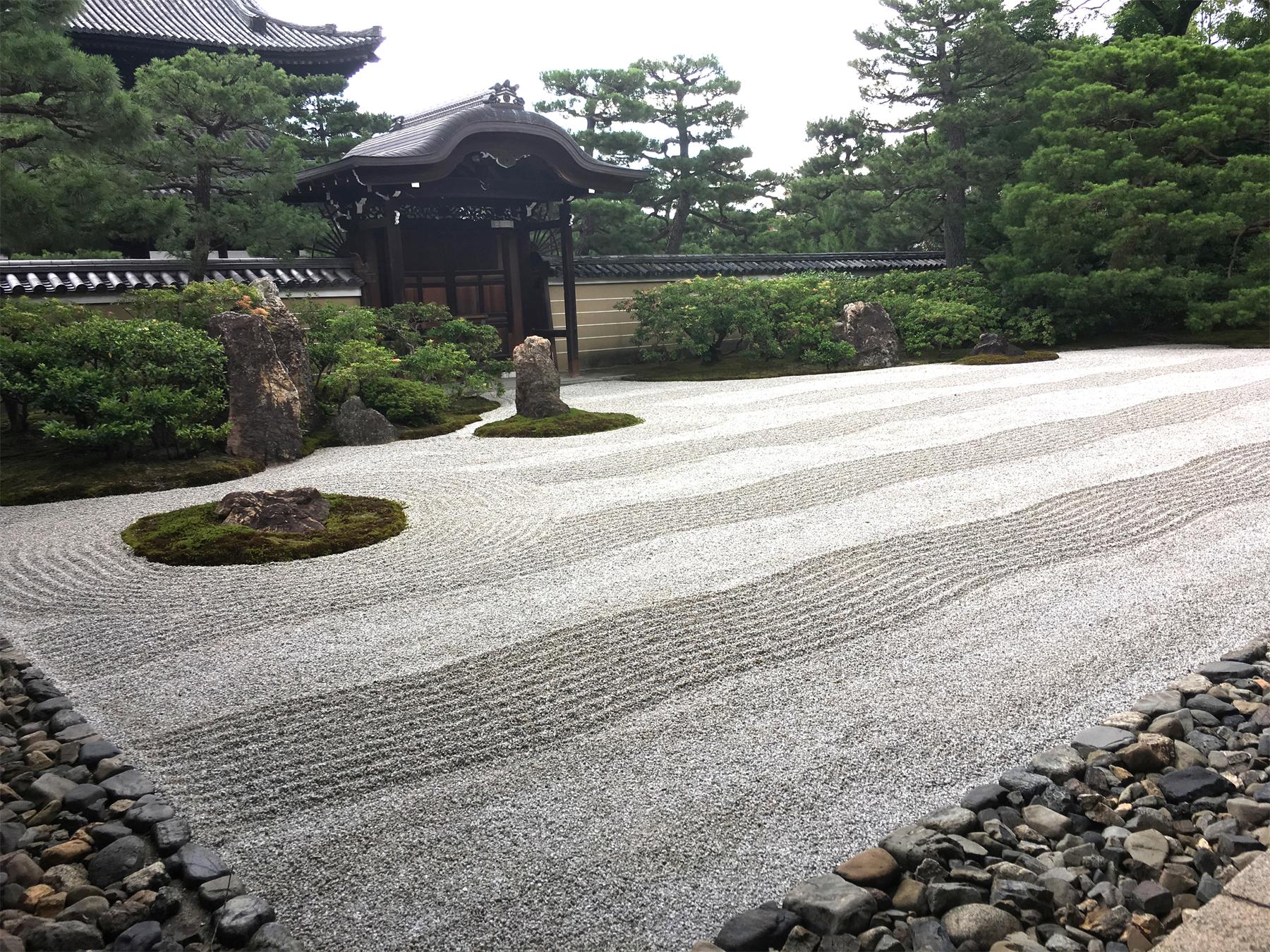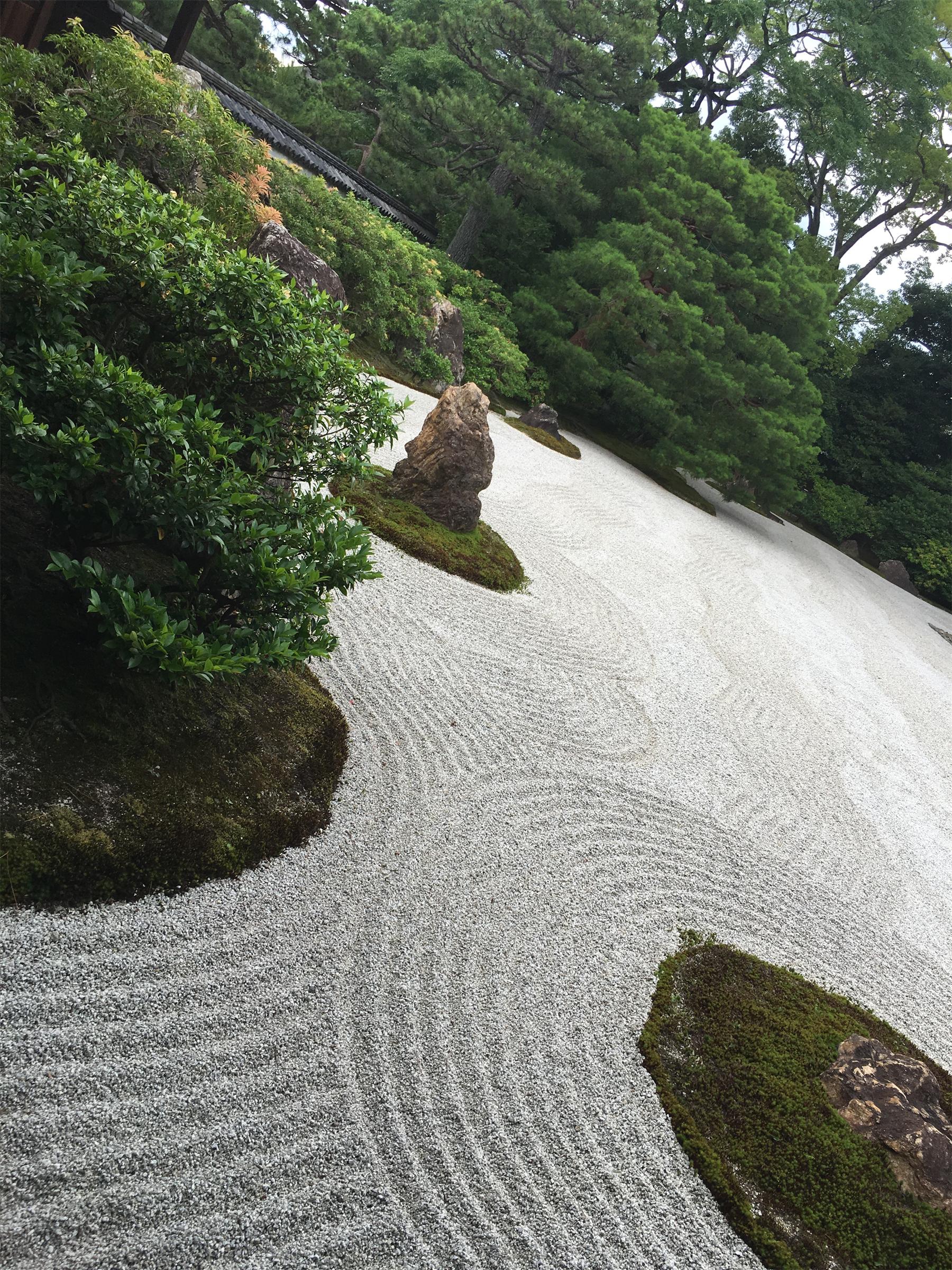 日本的枯山水,是日本“禅”的代表性事物之一。它以白沙作为水纹,象征海洋,以阴阳石代表小岛,形成了一个有机的整体,在方寸之间展示了主人博大的胸襟和深邃的思想,不仅体现了外在的庭院之美,也体现了人们内心的“无”之境界。以无形造有形,象征那些无限大、无限多的可能性,将宇宙间的天地万物都浓缩地呈现于这一沙一石一庭院之间。