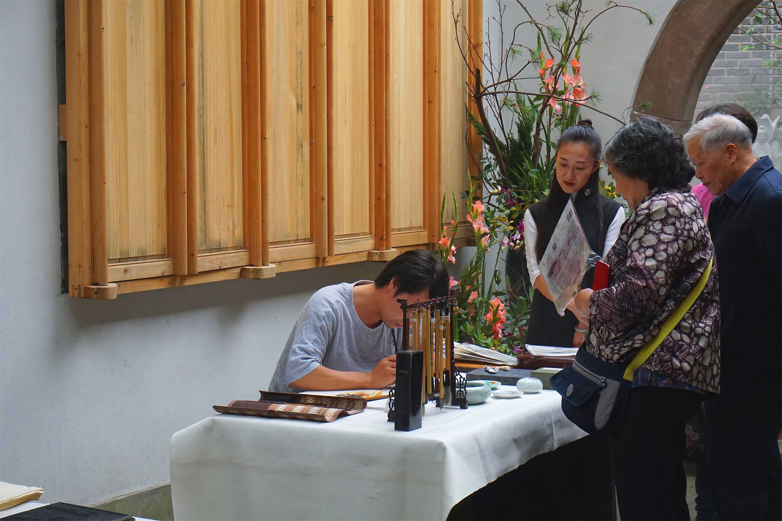承香堂画师赵伟在团扇之上为嘉宾作画,以西湖为主题,结合客人爱好进行创作。简单几笔,浓淡适宜,无尽禅意,让人获得身心的宁静。