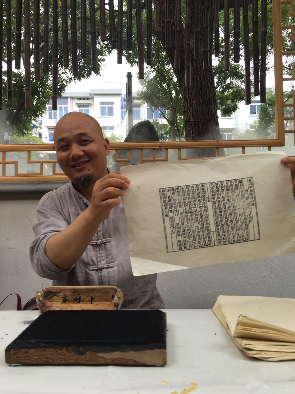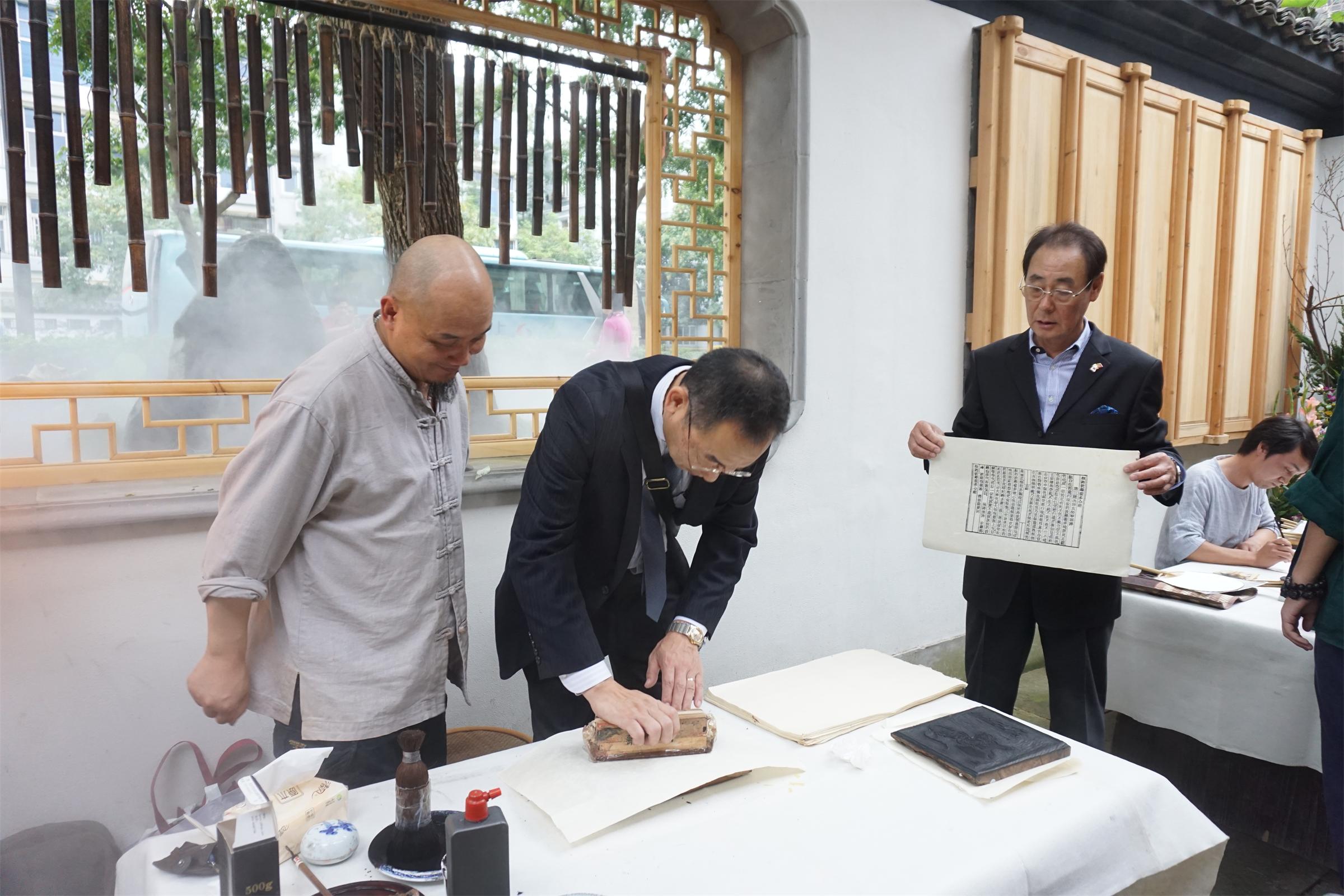 木板水印是集绘画、雕刻和印刷为一体,根据水墨渗透原理显示笔触墨韵的一种艺术作品。嘉宾们在著名的木版水印非遗传承人杭州十竹斋主人魏立中先生的指导下,亲手印一卷心经,净化心灵,留作纪念。