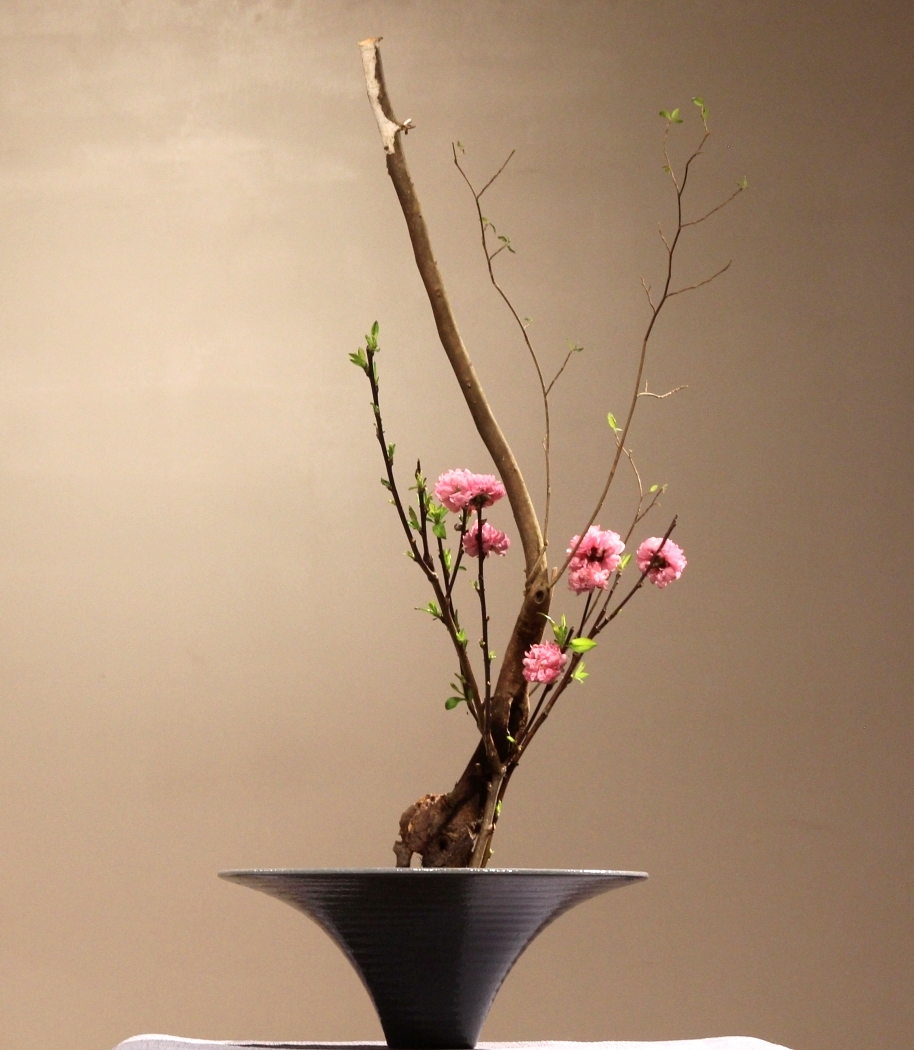 ![]() 作品名:杏花春 花材:杏花(2枝)、枯木(1枝) 花器:池坊宽口花器 作者:简光禧 |