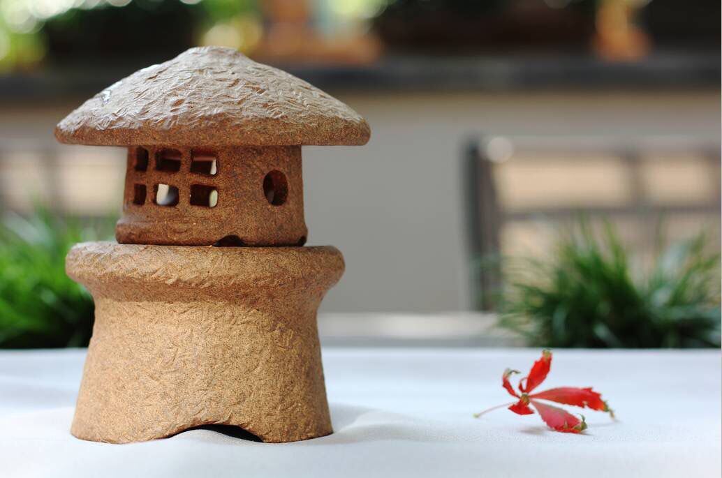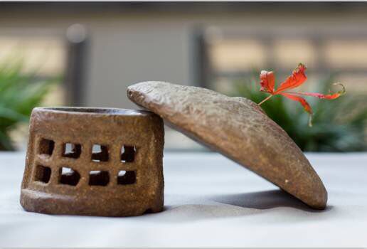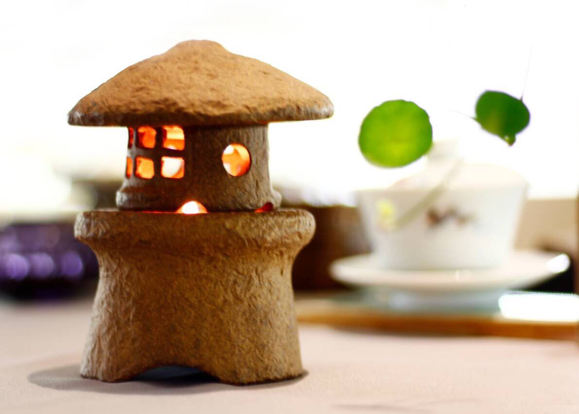 这件周妙文陶灯笼底座为圆筒型,下有凹空。底座上略似小盘,用来放置小烛。中间一个带着方孔似楼阁门窗的小陶筒,中部镂空,顶上小凹,可放置一些香料香粉。顶部为盖,隔着一层陶瓦,受着小烛传来的热量,慢慢的散发着香粉的香气,好似文火慢煎,静静的感受由内带出一缕缕怡人的香味。