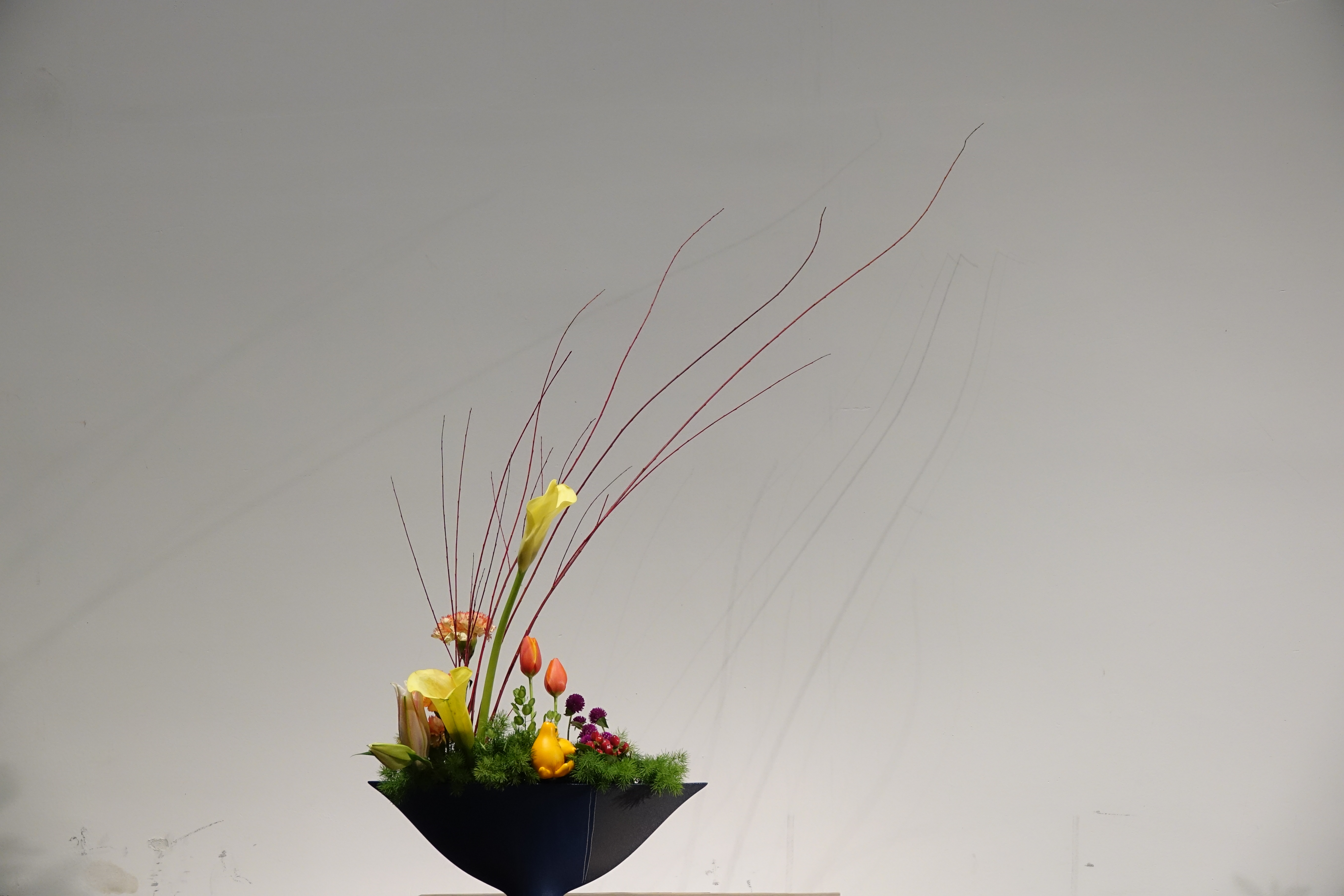 就艺术的属性而言,插花艺术是空间艺术的一种,属于造型美术范畴,与音乐、诗歌、文学之以耳朵欣赏的『时间艺术』不同,而是以线条色彩机能表达文化意象,与绘画、雕塑、建筑等艺术具有异曲同工之妙。