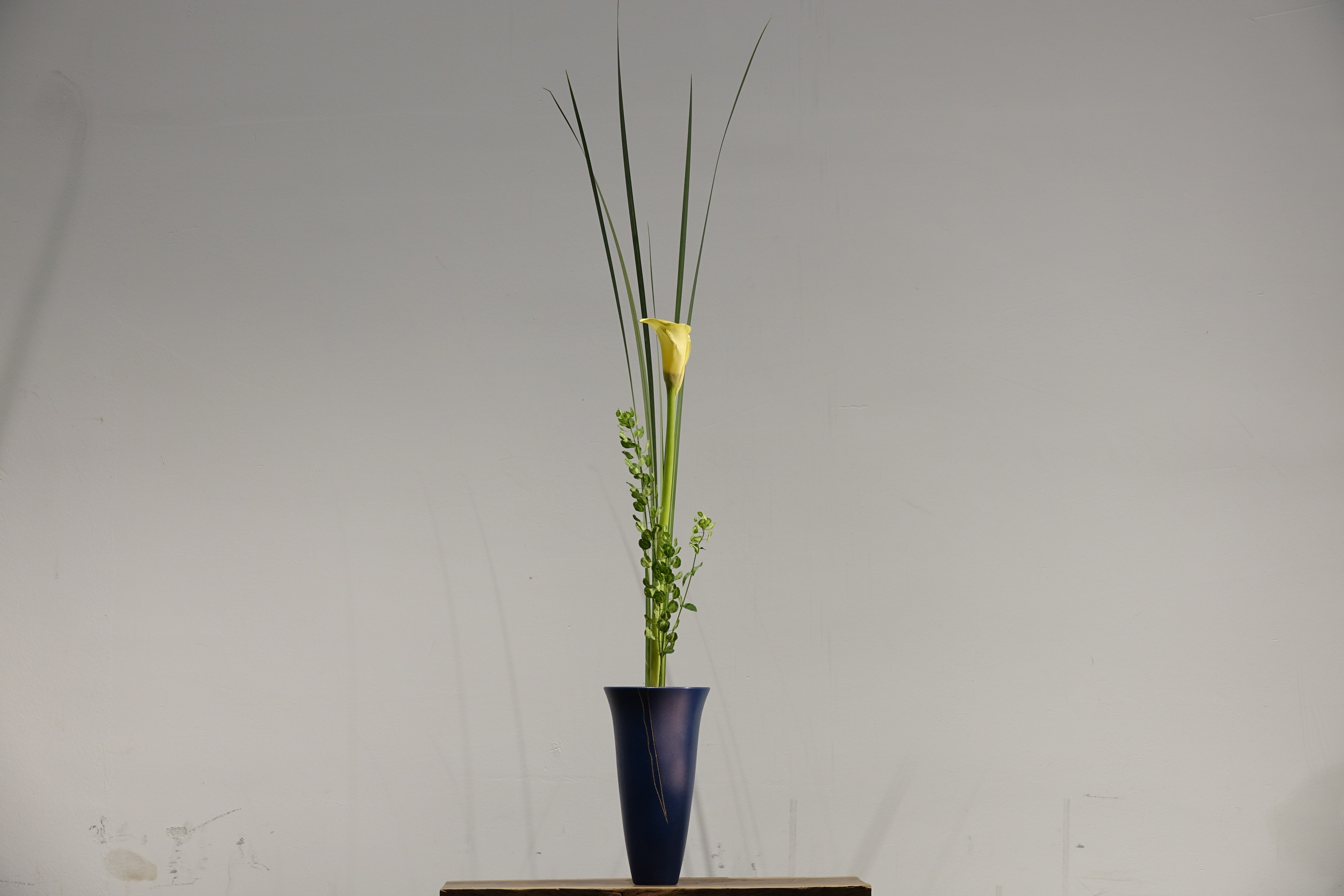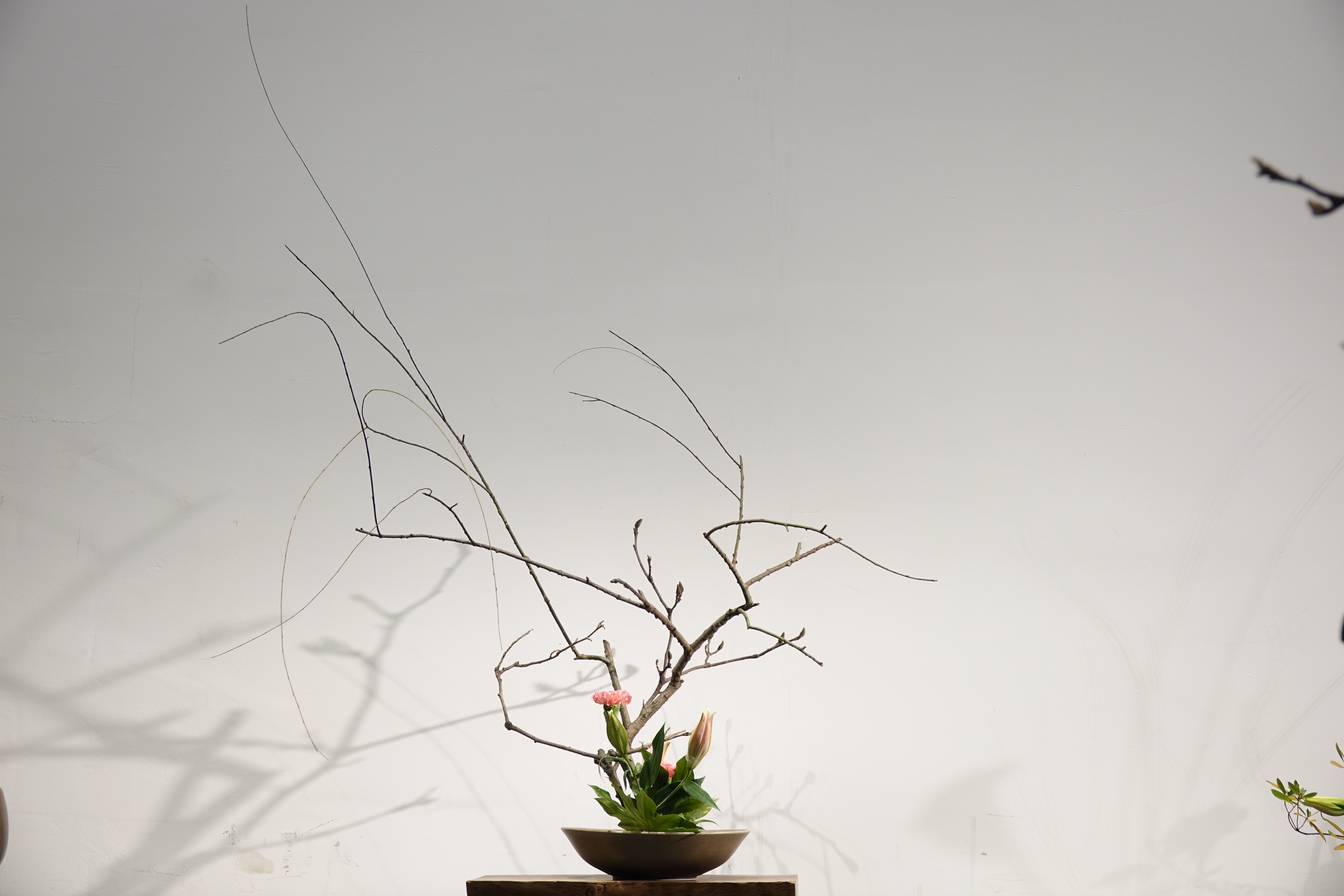 不着花的枝叶也在取材范围,插花风格忽视色彩,在花、枝、叶的结构上以『清』为精神之所在,『疏』为意念之依归,注重线条机能,脉络分明,神圣雅致,条理有序。