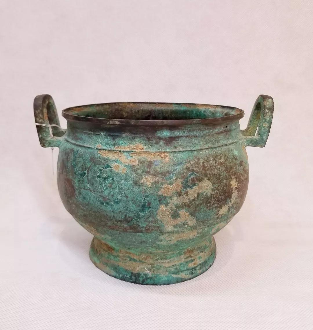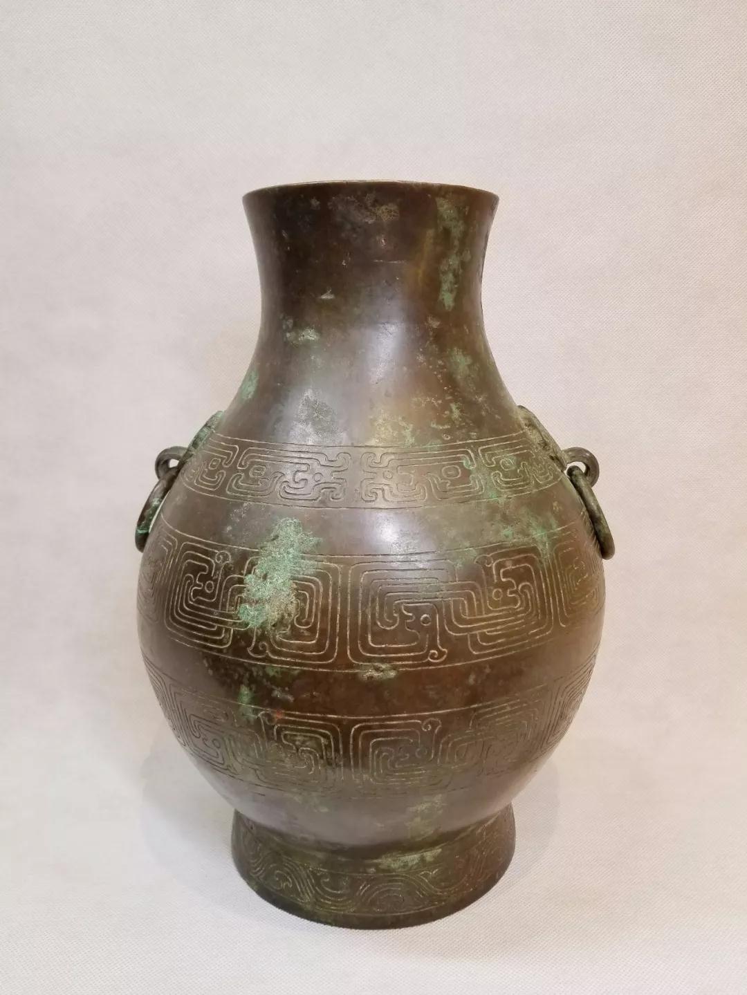 此款花器为宋代带盖衔环壶,错金围猎图带盖,圆口,两侧兽面衔环壶,很经典的器型。