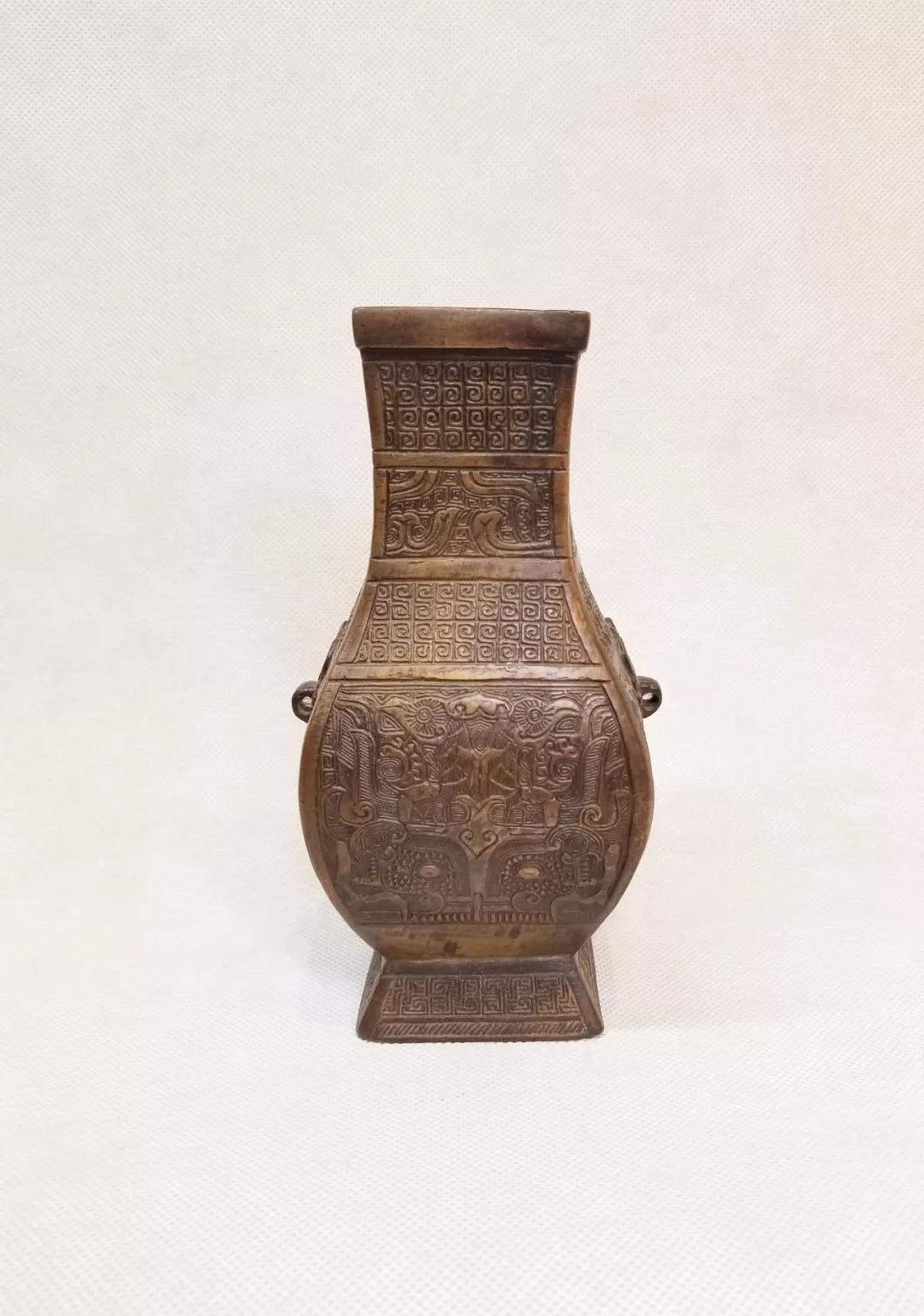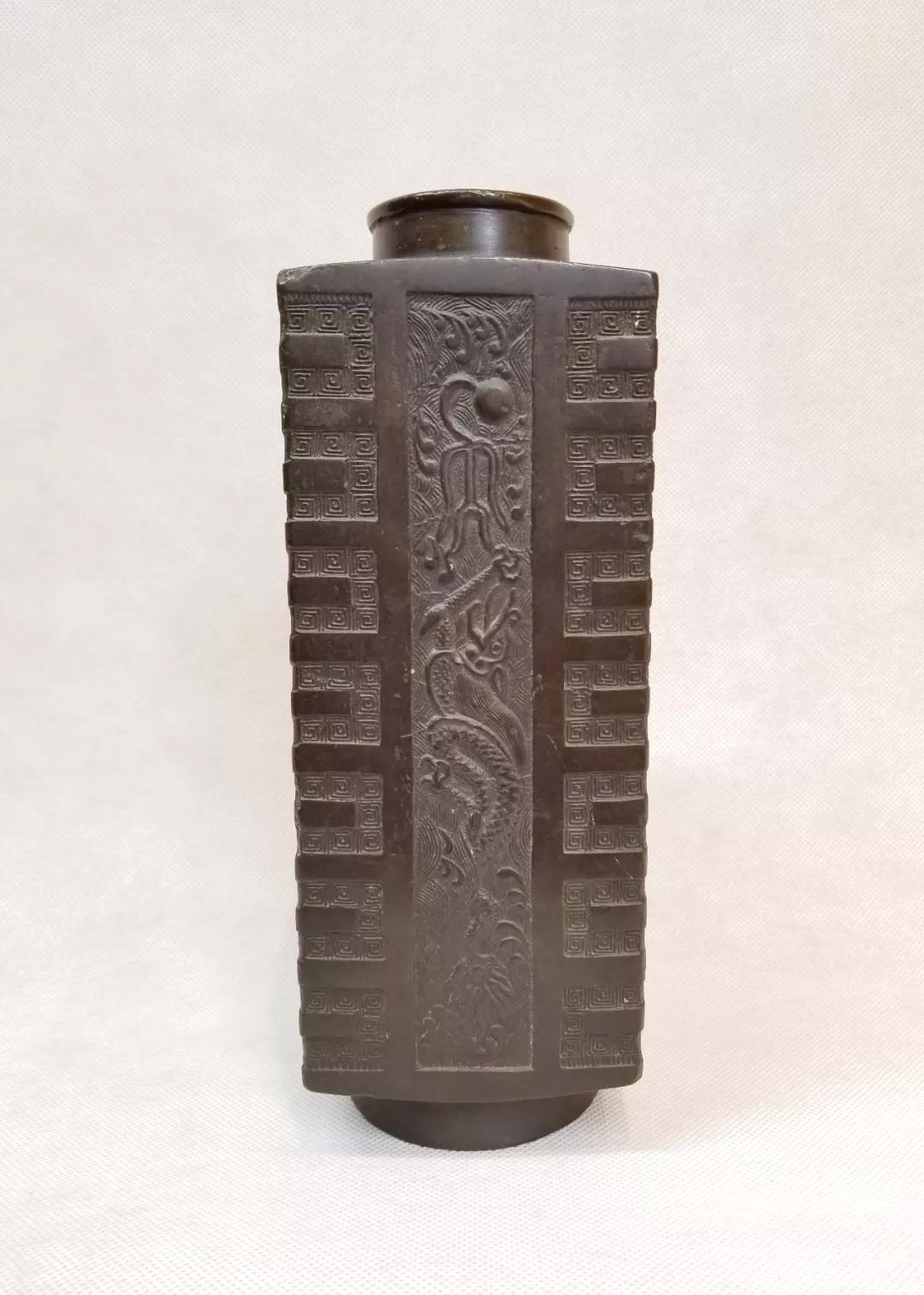 这件花器名为四方尊,方口鼓腹,颈部饰兽面龙纹四方尊。
