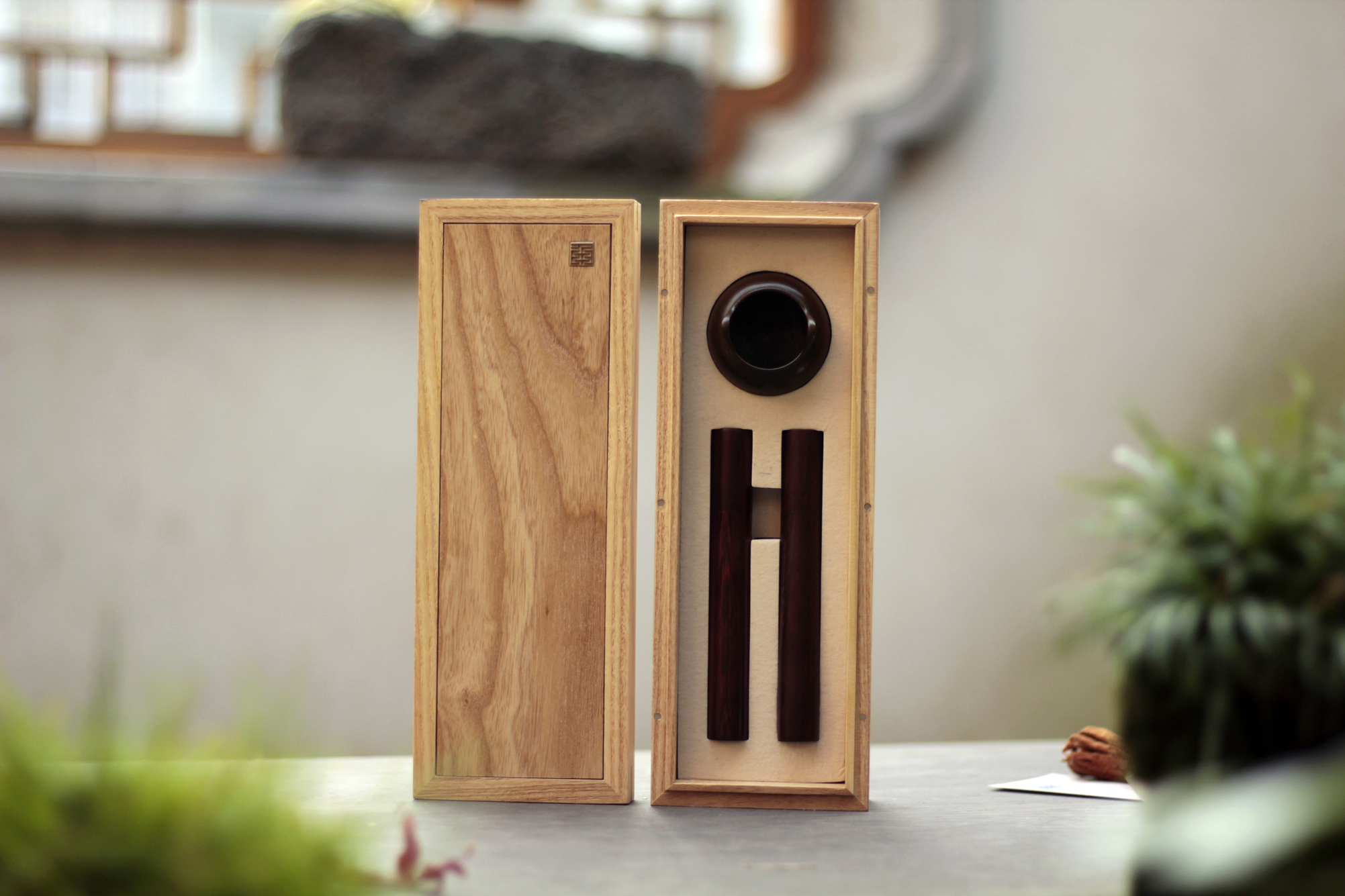 除香炉外,礼盒内还搭配了星洲水沉、惠安奇肉沉和血檀香筒,是一套完整的乐艺品香用具。