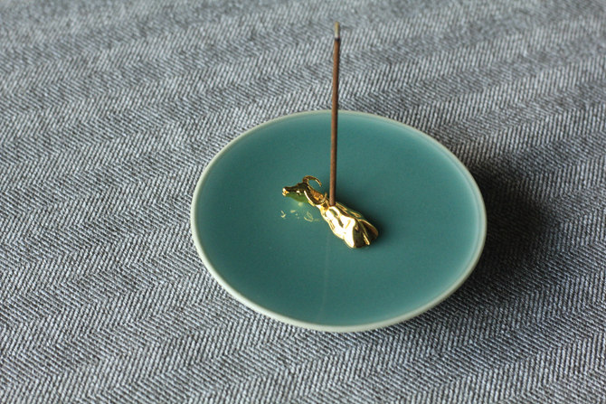 香碟材质为龙泉青瓷,采取厚釉的工艺形式,使得香碟如碧波之涌金池。