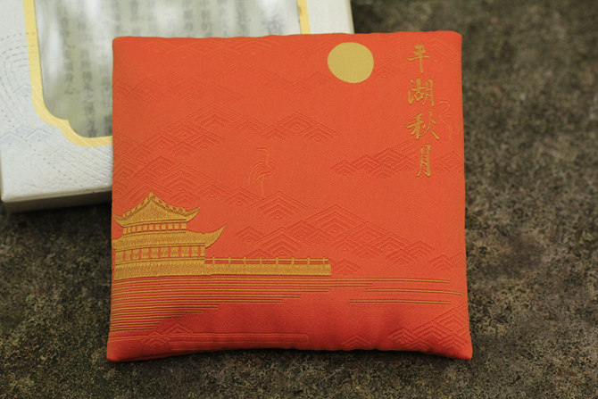 汉芳包正面织有“平湖秋月”四字,并将平湖秋月处之亭台、明月复织其上。