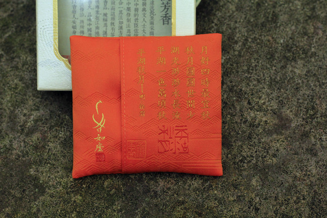 汉芳包内含以檀香、安息香、桂花、芸香、零陵香、冰片等九种道地香材按古法规制精制而成香包内胆,