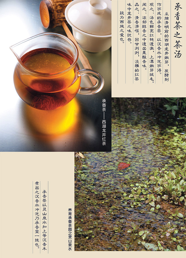 眾所周知,沖泡龍井茶須用虎跑水,如此才能茶水交融,相得益彰。承香堂則採用靈山泉水加上等沉香木煮出之沉香水來提升紅茶的口感和香味。觀此茶,湯色呈鮮亮紅豔,絢麗悅目;聞則濃郁醇香之中透出果酸的香味;品嘗一杯,唇齒留香,回甘洌洌。喝過的朋友都無不讚歎『西湖龍井紅茶』乃如廬承香堂一絕。