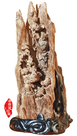 『和合二仙』:印尼达拉干沉香好料,得此好料,即请工艺大师命题雕刻而成。寒山手持荷花;拾得手捧香盒,和合而生万物。经雕刻后光泽耀人,惟妙惟肖。实为一件难得的收藏品。